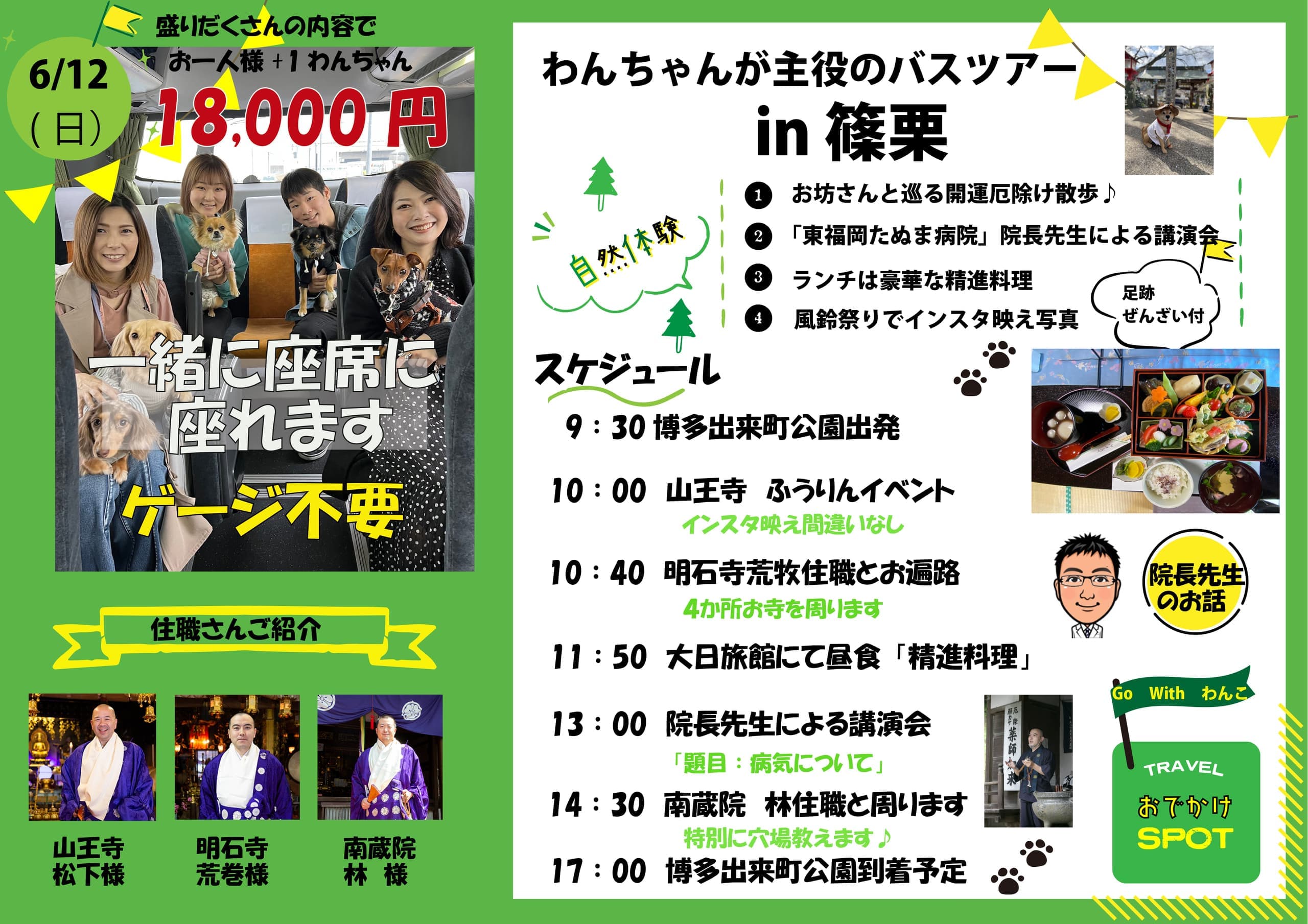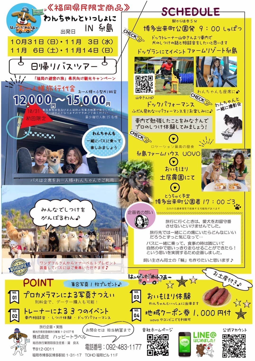 九州最大のわんちゃんフェスの『わんだふる』のイベントにみんなで参加しませんか?宮崎はなかなか遠いので行きたくても運転が・・・というお客様には必見です!到着後はみんなでBBQを楽しんだ後は、3時間イベントを自由散策いただきます。ワンちゃんと一緒に参加できるイベントが盛りだくさんです♪