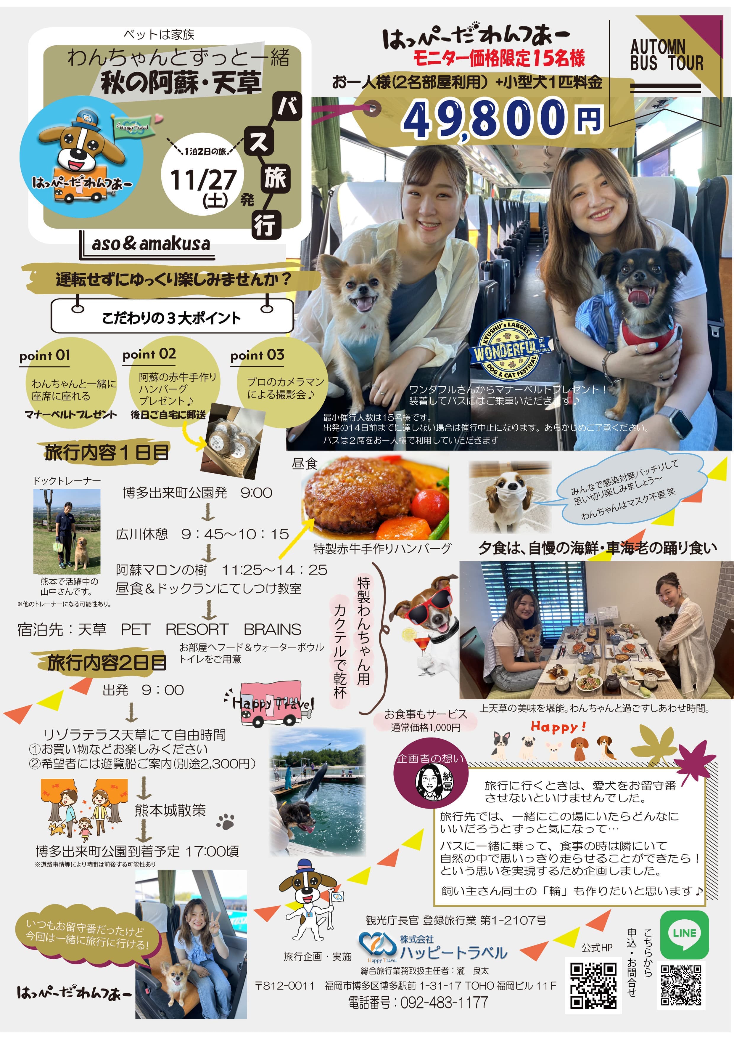 九州最大のわんちゃんフェスの『わんだふる』のイベントにみんなで参加しませんか?宮崎はなかなか遠いので行きたくても運転が・・・というお客様には必見です!到着後はみんなでBBQを楽しんだ後は、3時間イベントを自由散策いただきます。ワンちゃんと一緒に参加できるイベントが盛りだくさんです♪